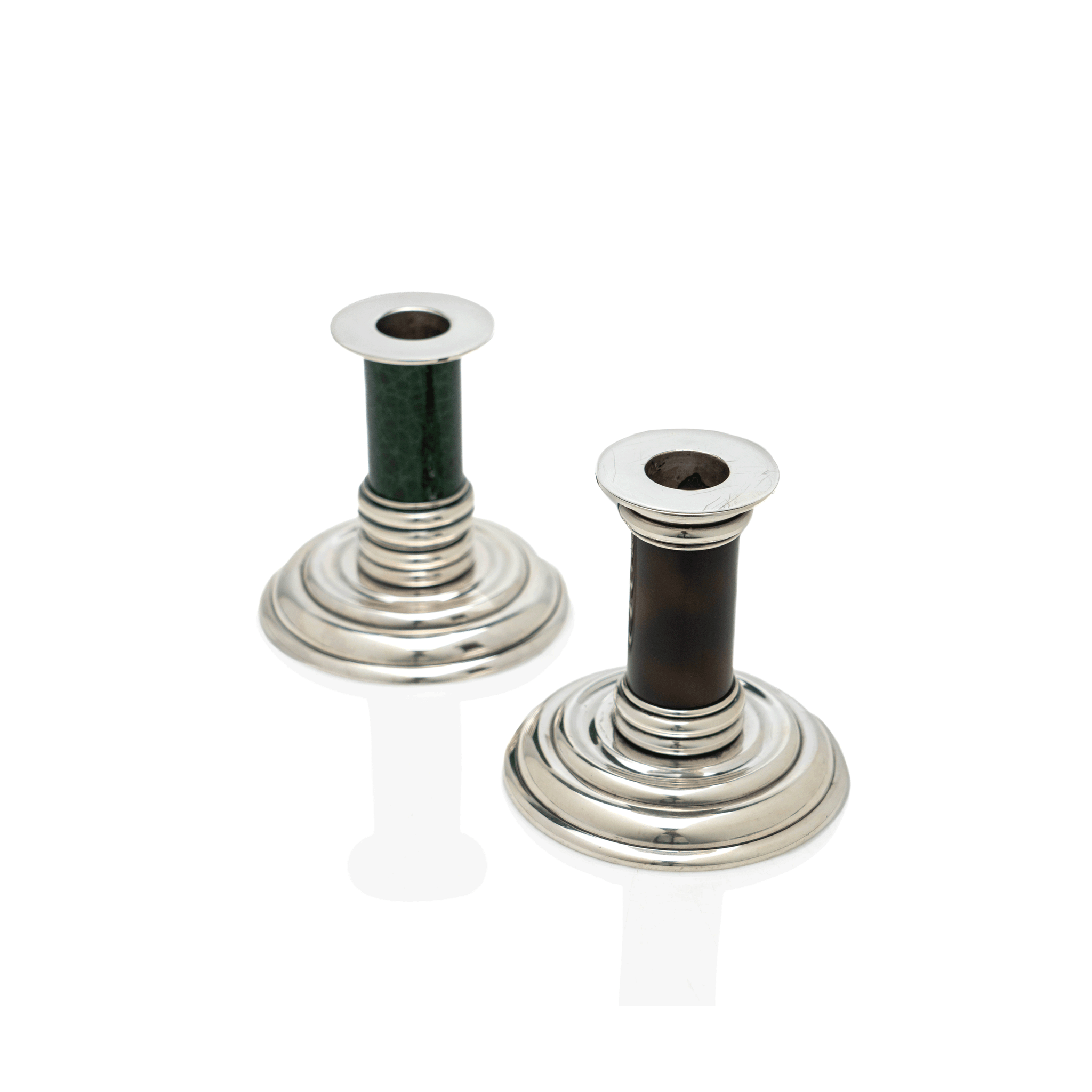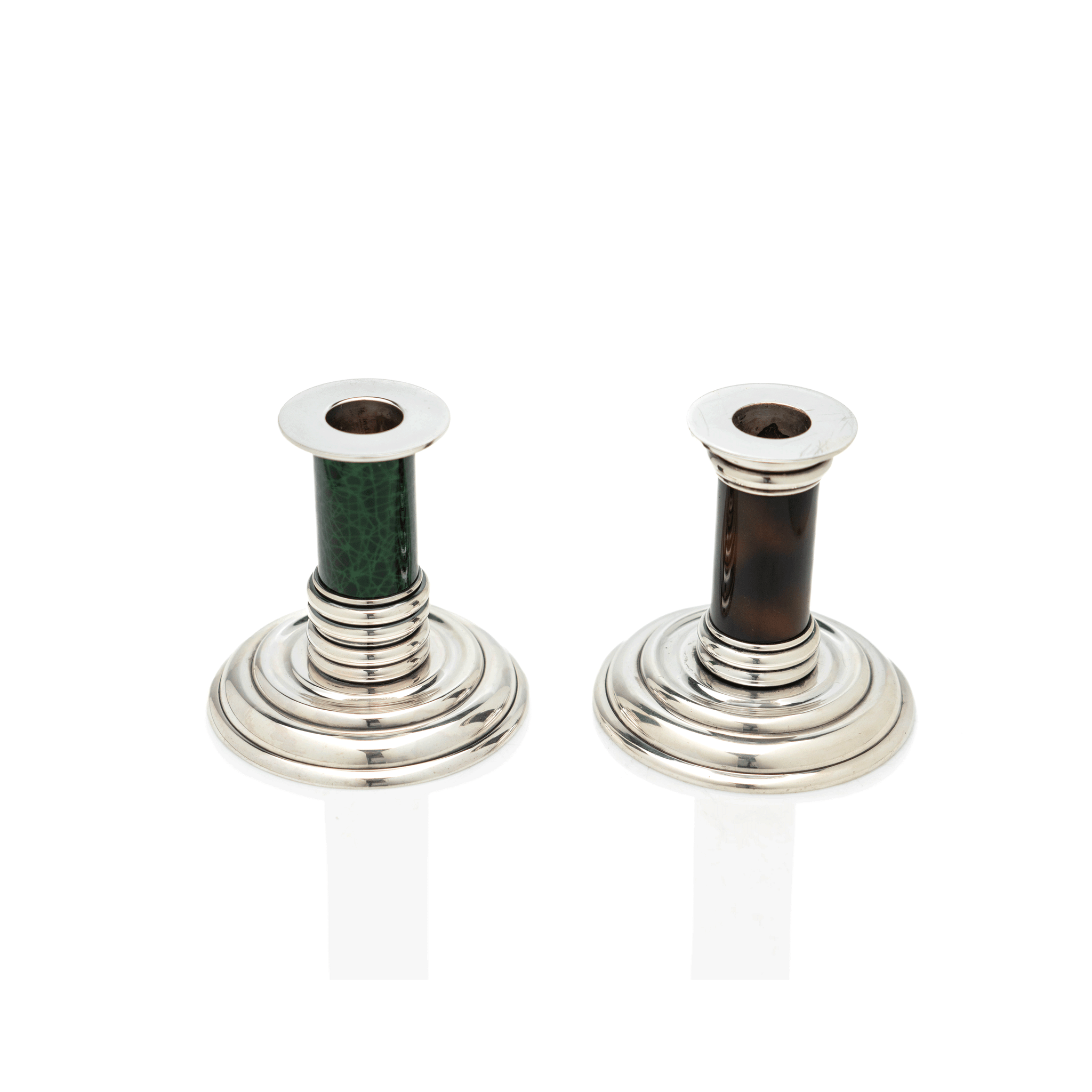 A fine and elegant pair of Puiforcat candlesticks in silver plated brass with an enamel body. A stepped base is complemented by a stacked collar, giving these chic candlesticks added texture.